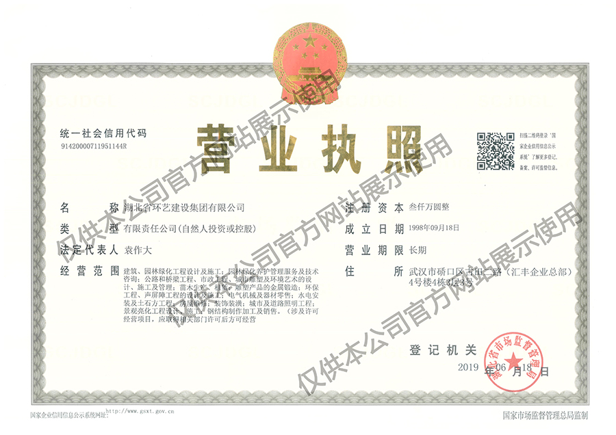 2019年6月,湖北省環(huán)藝園林工程有限公司正式更名為湖北省環(huán)藝建設集團有限公司,在集團公司董事長(cháng)袁作大的領(lǐng)導下,公司又邁上新臺階,踏上新征程。