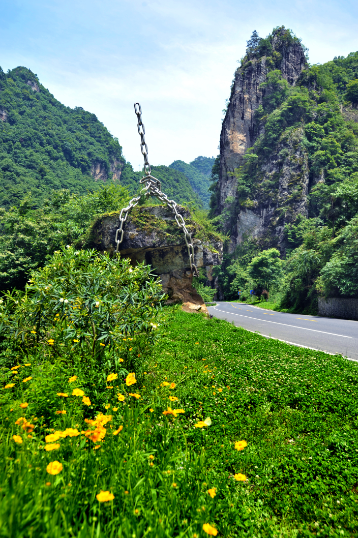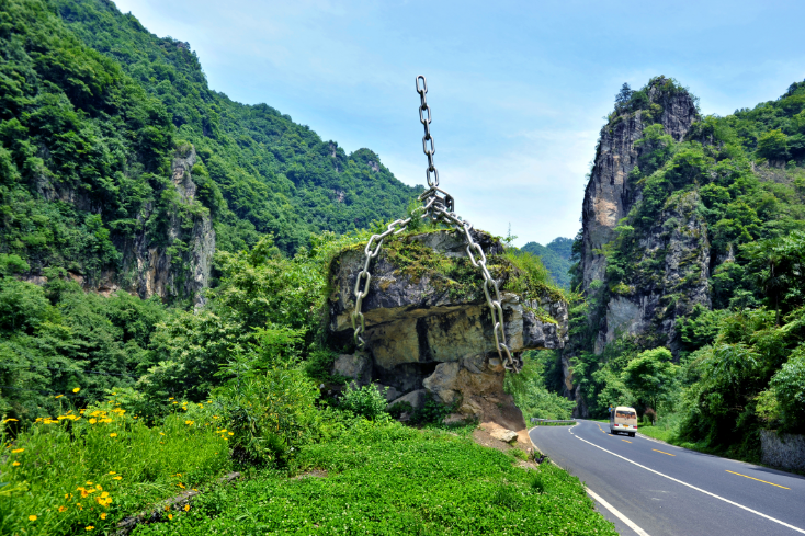 利用裸露巖石的特征設計的雕塑《移》,不銹鋼鏈條向上的張力將裸露巖石拔起,似移非移,寓意“自然的就是最美的”,即使“鐵鏈”已經(jīng)裝好了,但不該移的堅決不移,充分體現了旅游公路保護生態(tài)環(huán)境的理念。該雕塑采用“借景”的手法,把自然界的“勢”悄然轉變成了美,營(yíng)造了動(dòng)感的氛圍,形成“妙手偶得,渾然天成”的景觀(guān)作品,實(shí)現了公路與自然的和諧。
