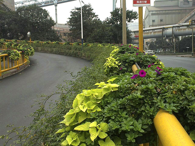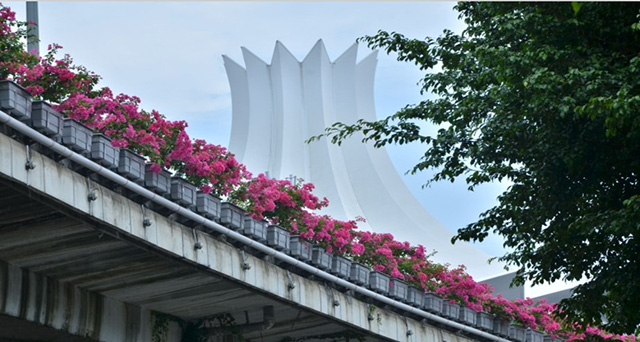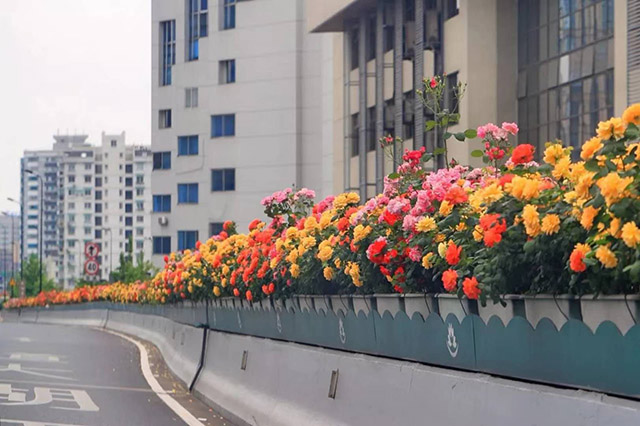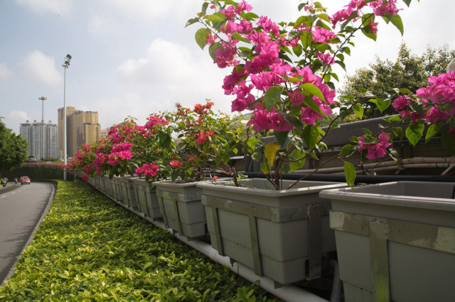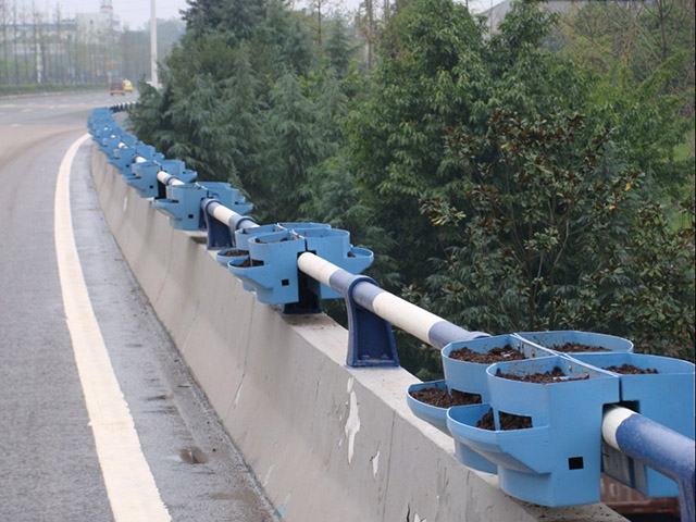 依然采用頂置式容器,變換鋼結構方案,在不破壞橋體的情況下,將立體綠化容器側掛于高架橋護欄的一邊,效果突出,是打造城市空中彩帶風(fēng)光的不二選擇。